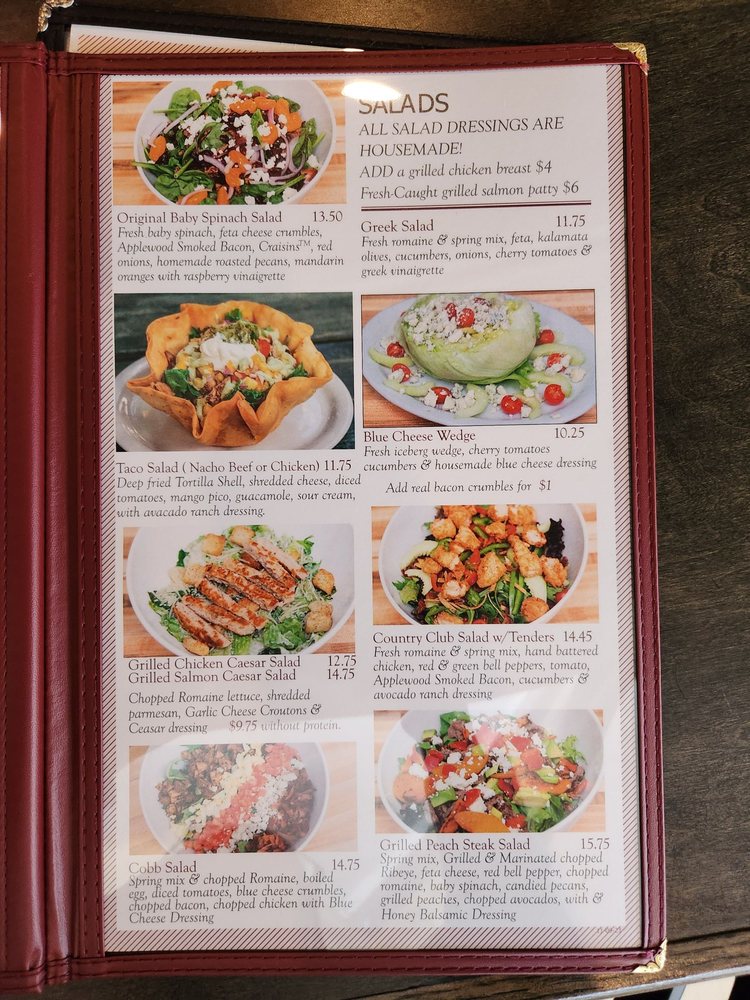 Fresh Baby Spinach, blue cheese crumbles, Applewood Smoked Bacon, Craisins, red onions, homemade roasted pecans, fresh sliced strawberries, fresh blue berries & rasberry vinaigrette